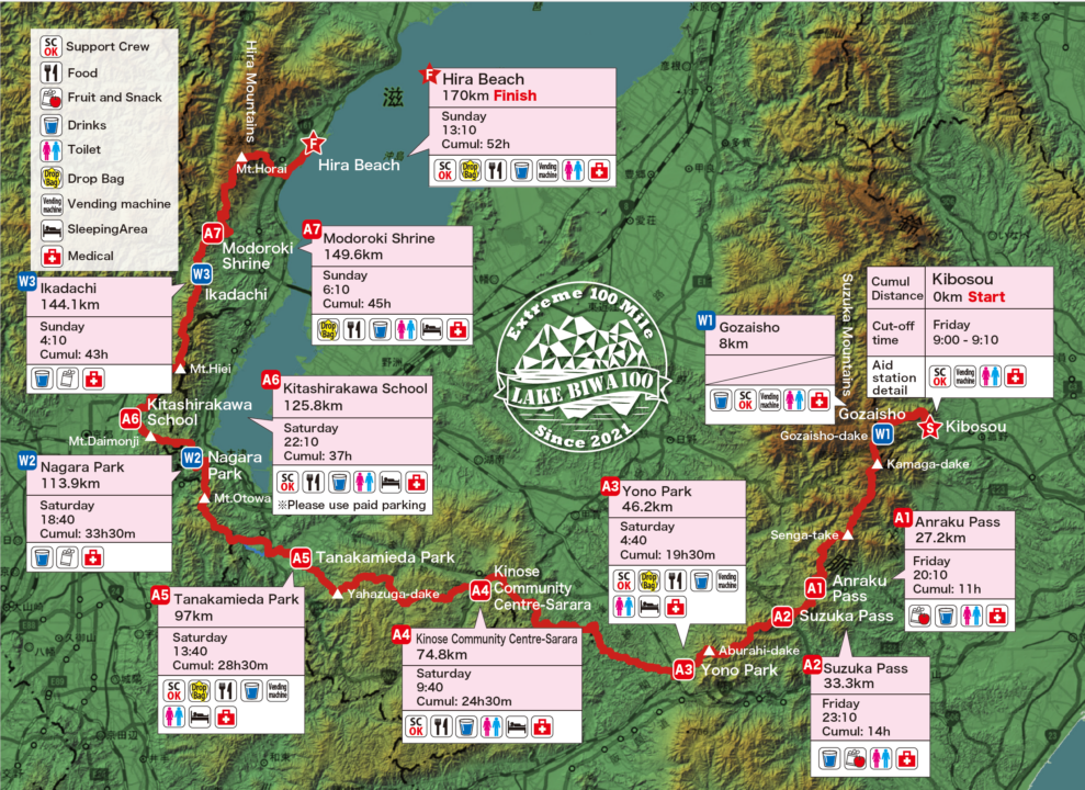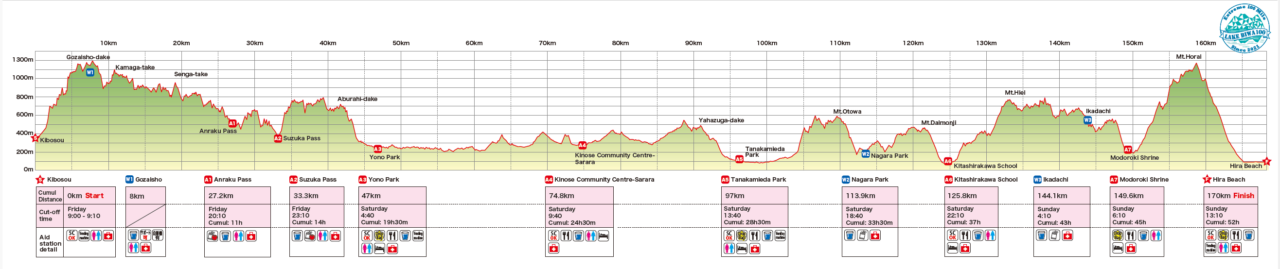 The mountains surrounding Lake Biwa rewards participants with various and exciting challenges, as well as beautiful scenery along the course. The course starts with the rough mountainous area in Suzuka Mountains, climbing up Mt. Gozaisho, the highest peak of the race at 1212m. After navigating the technical Suzuka range, runners enter Shiga Prefecture on the Tokai Nature, a relatively flat section.